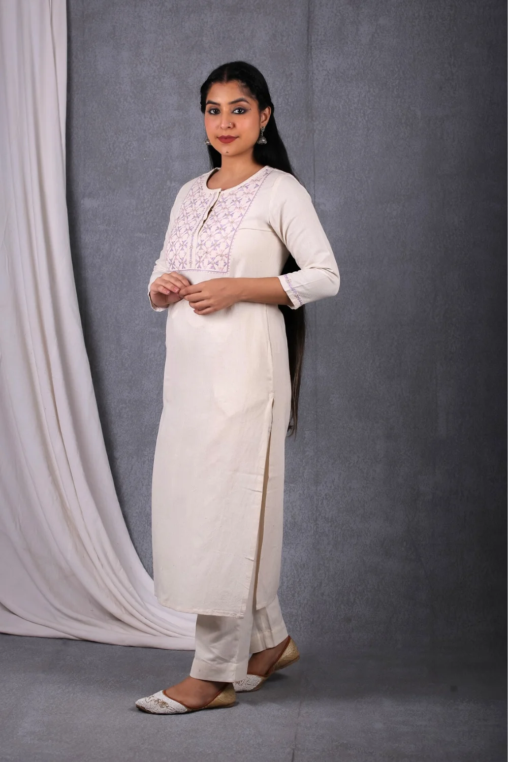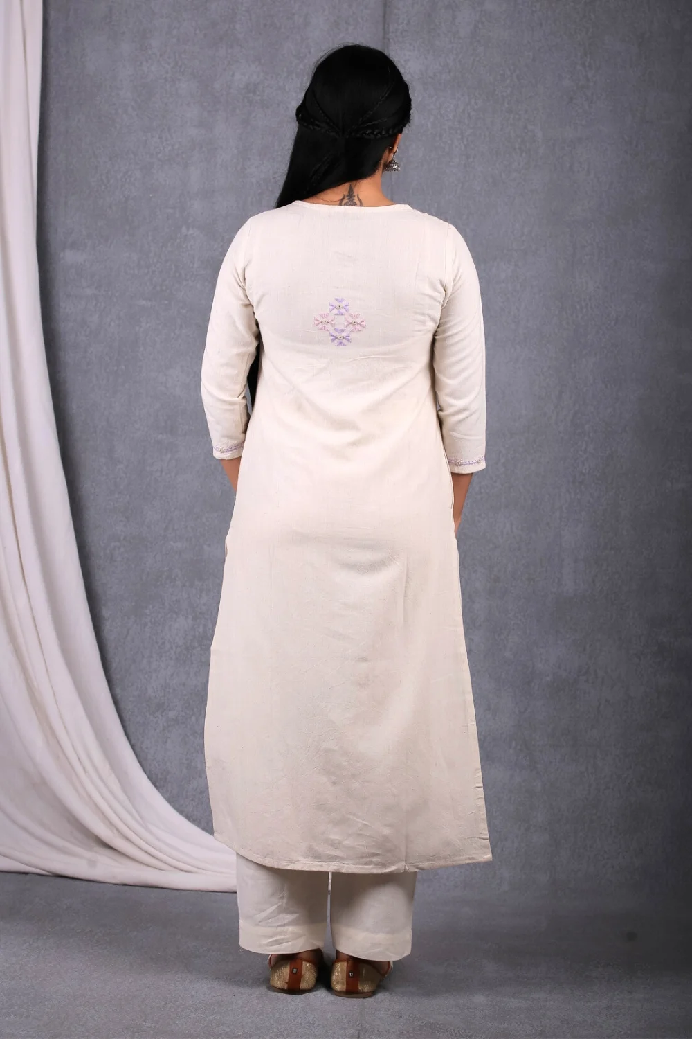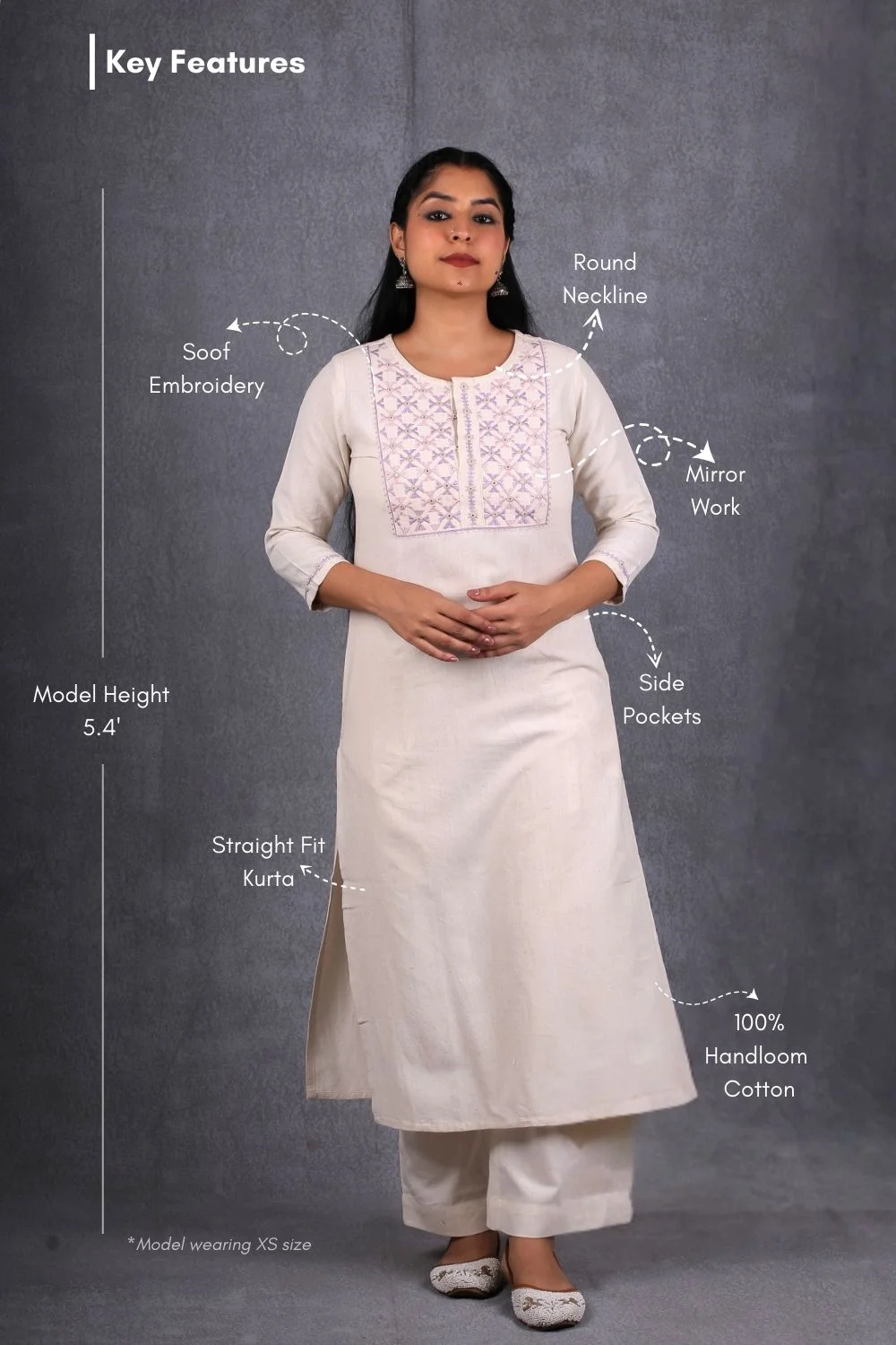 Introducing the Banjara 3.0 craftsmanship with our Antara Straight Kurta, a celebration of heritage and contemporary style. This kurta features an Straight fit silhouette, made from the finest off-white handloom fabric woven by the skilled hands of Thar weavers from Pugal, Bikaner.